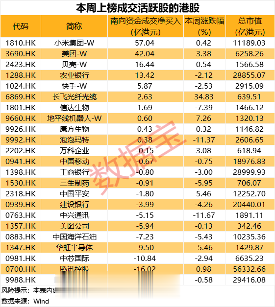 从成交净买入金额来看,南向资金对大型科技股流向不一,小米集团-W本周获南向资金净买入金额最高,达到57.04亿港元,近两周南向资金净买入累计金额超过100亿港元,其他还有美团-W本周获南向资金净买入金额42.04亿港元,阿里巴巴-W遭南向资金净卖出31.21亿港元,腾讯控股净卖出16.02亿港元,中芯国际净卖出10.84亿港元。